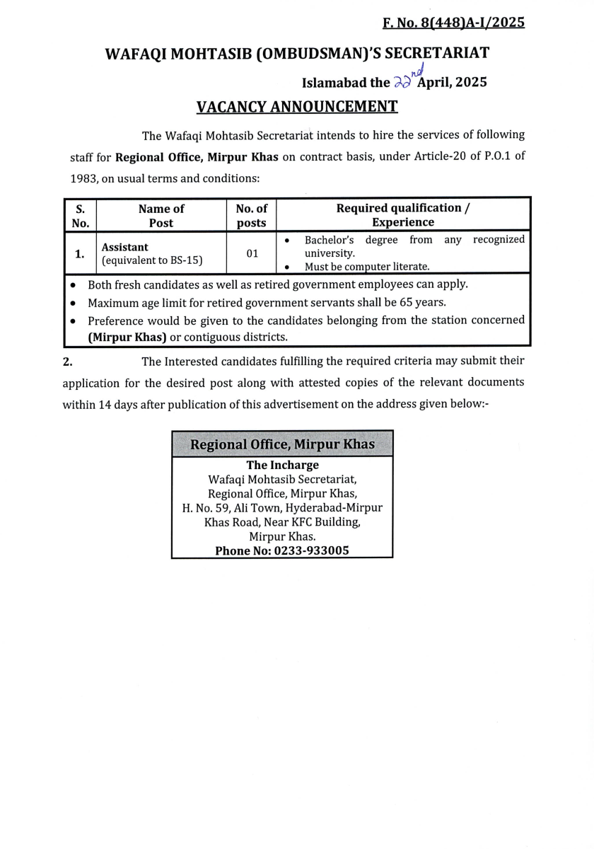 Job opportunity on the contract basis under Article-20 of P.O.1 of 1983 for the Wafaqi Mohtasib Secretariat (WMS) Regional Office Mirpur Khas.