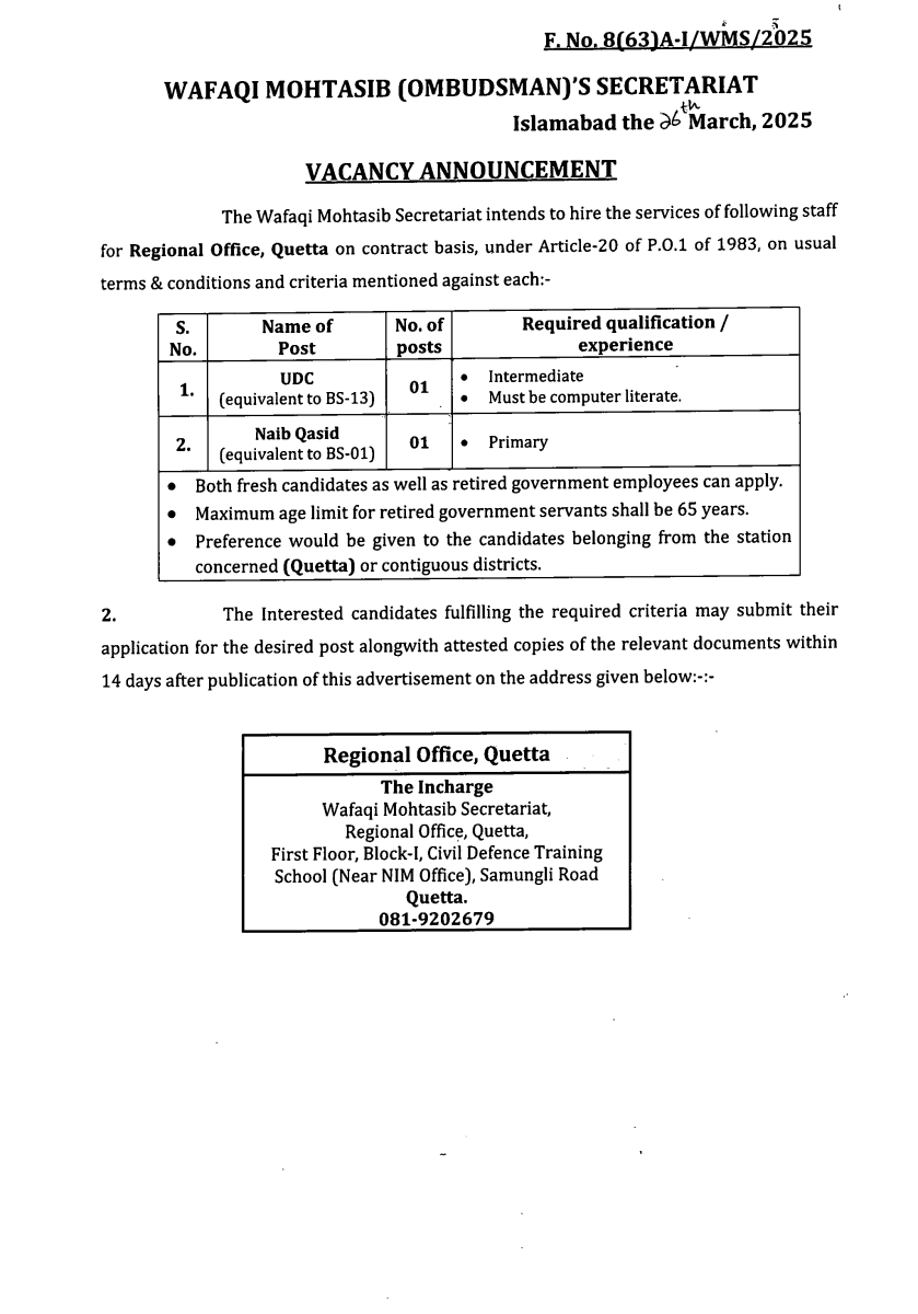 Job opportunities on the contract basis under Article-20 of P.O.1 of 1983 for the Wafaqi Mohtasib Secretariat (WMS) Regional Office Quetta.