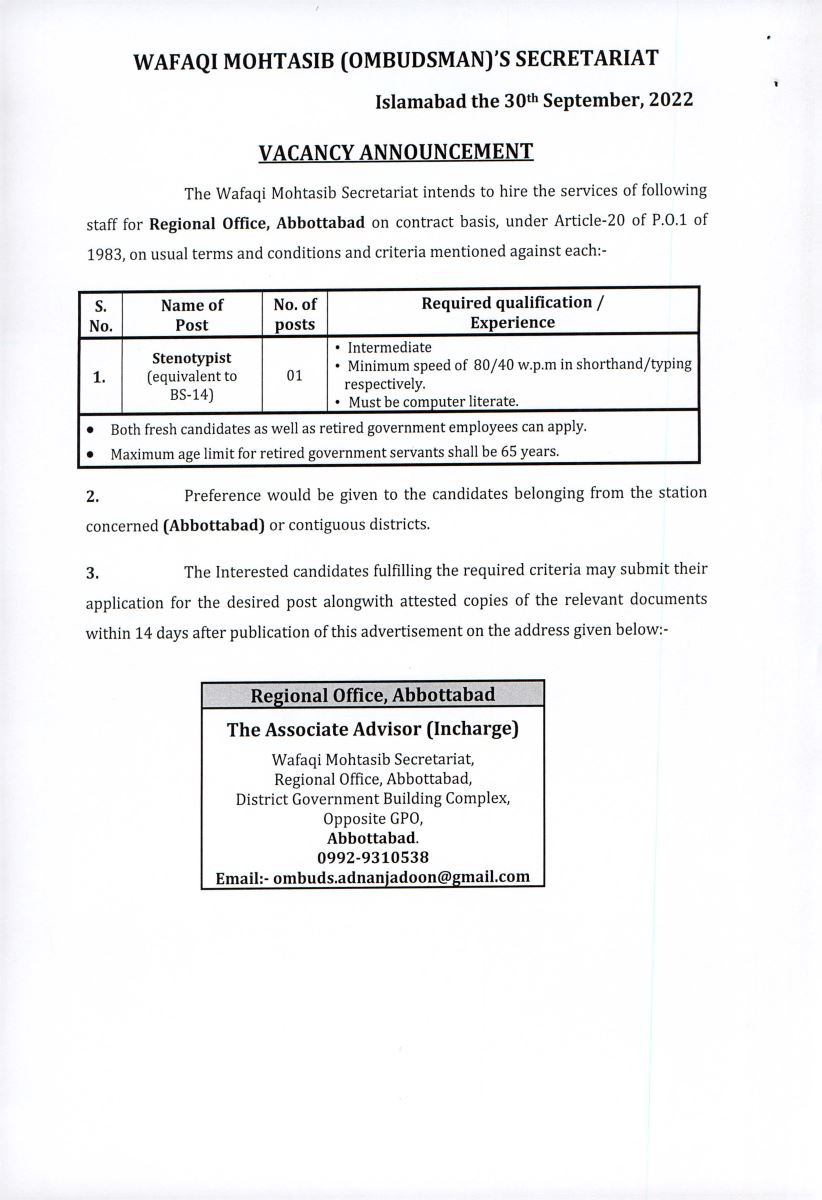 Job opportunity on the contract basis under Article-20 of P.O.1 of 1983 for the Wafaqi Mohtasib Secretariat (WMS) Regional Offices Abbottabad.