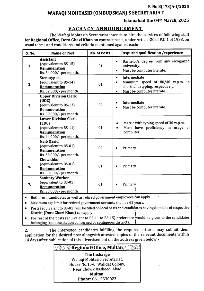 Job opportunity on the contract basis under Article-20 of P.O.1 of 1983 for the Wafaqi Mohtasib Secretariat (WMS) Regional Office Dera Ghazi Khan.