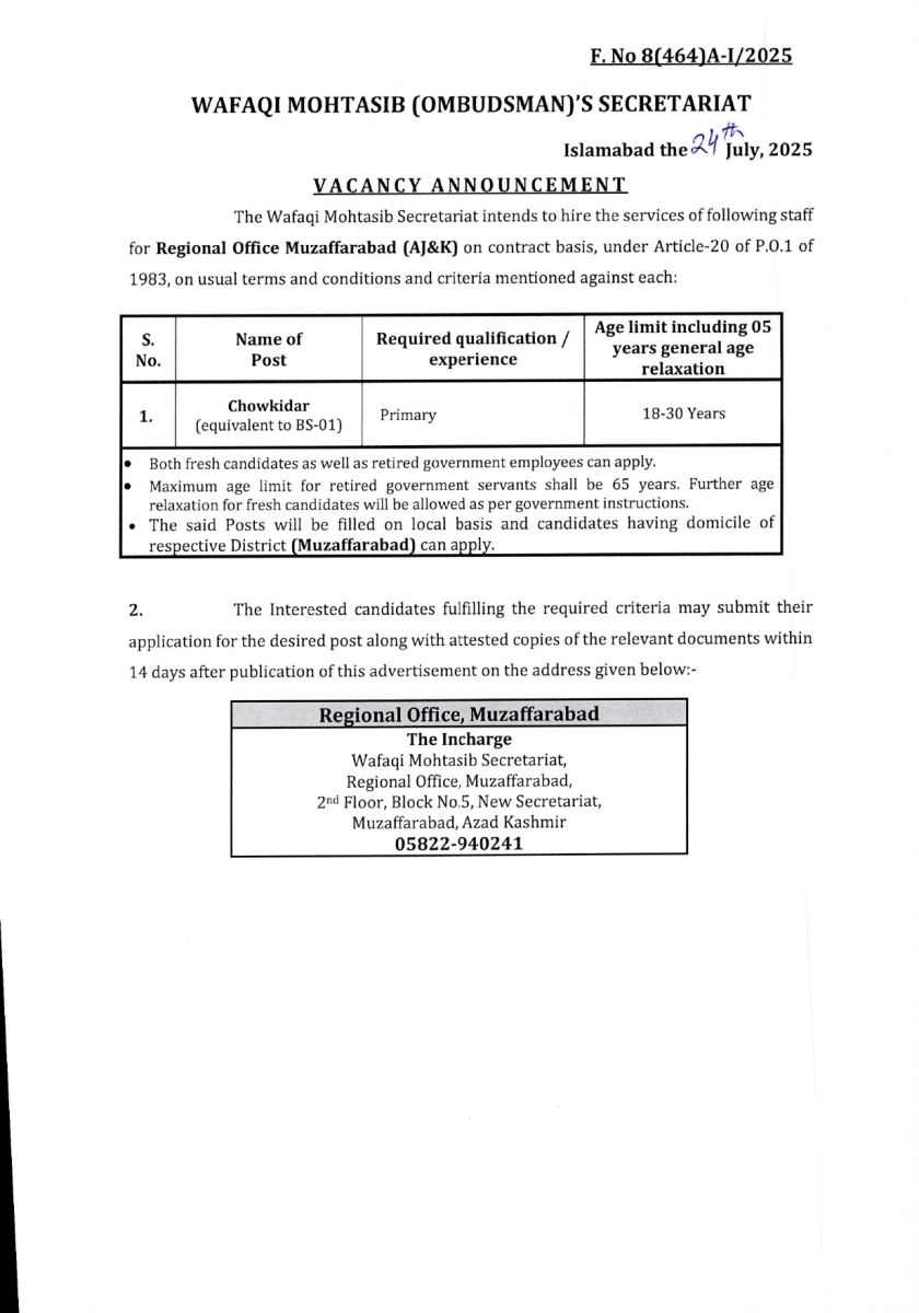Job opportunity on the contract basis under Article-20 of P.O.1 of 1983 for the Wafaqi Mohtasib Secretariat (WMS) Regional Office Muzaffarabad.