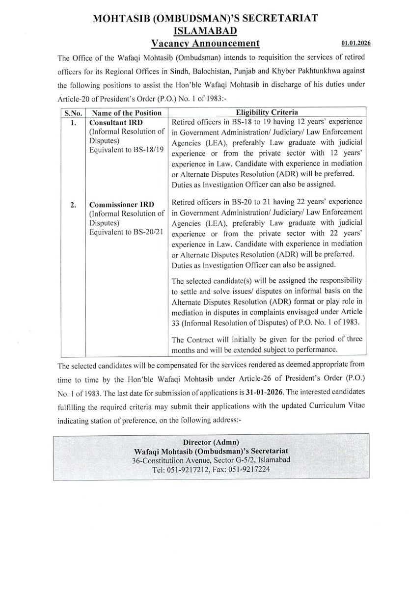 Wafaqi Mohtasib (Ombudsman)'s Secretariat وفاقی محتسب سیکر ٹیر یٹ