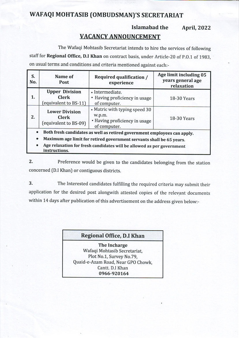 Job opportunities on the contract basis under Article-20 of P.O.1 of 1983 for the Wafaqi Mohtasib Secretariat (WMS) Regional Office D. I Khan.