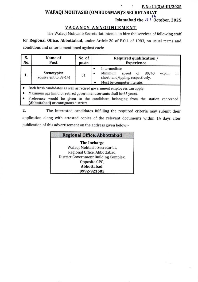 Job opportunity on the contract basis under Article-20 of P.O.1 of 1983 for the Wafaqi Mohtasib Secretariat (WMS) Regional Office Abbottabad.