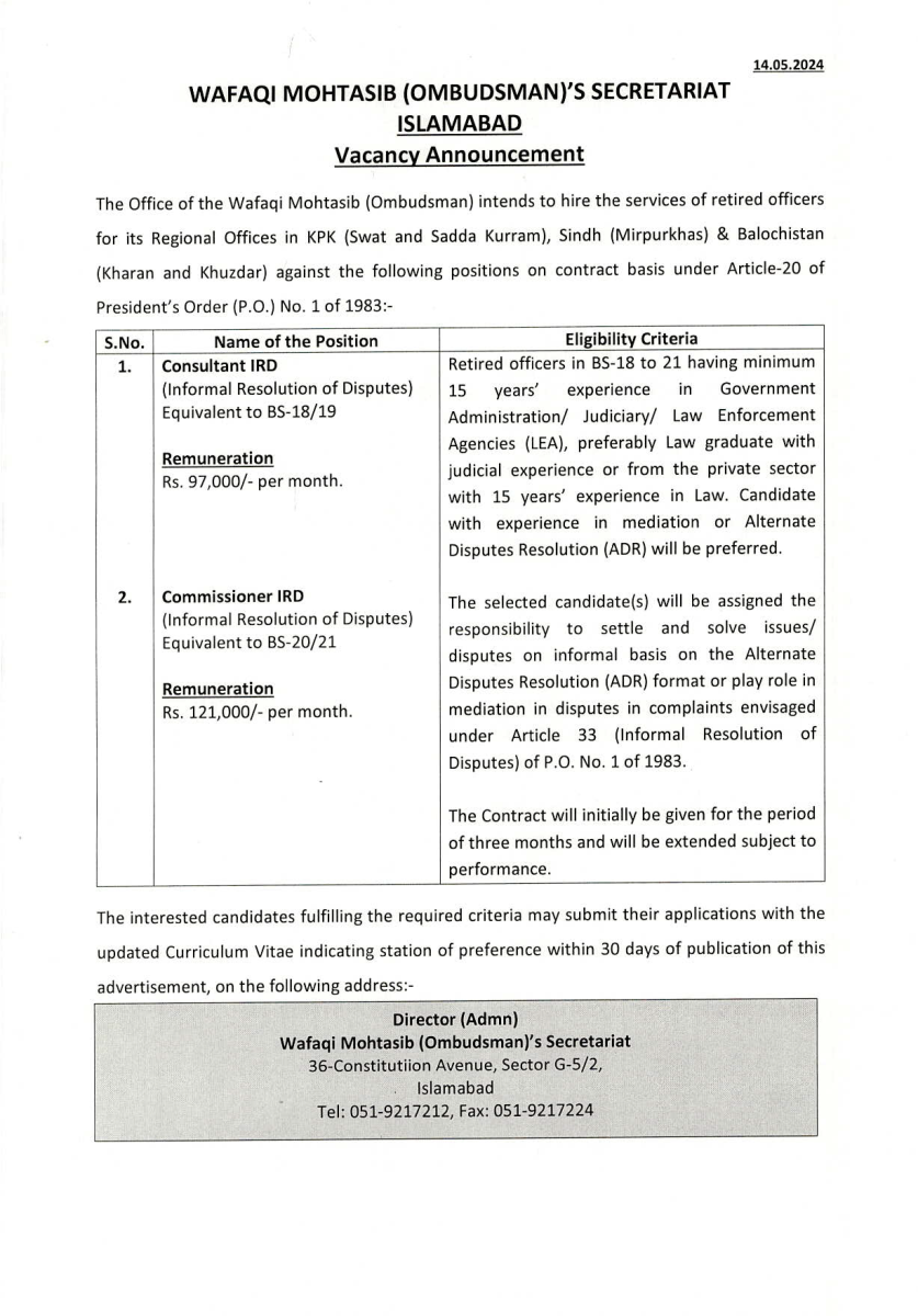 JOB OPPORTUNITY ON CONTRACT BASIS FOR COMMISSIONER/CONSULTANT INFORMAL RESOLUTION OF DISPUTE (IRD) IN VARIOUS REGIONAL OFFICES OF WMS.