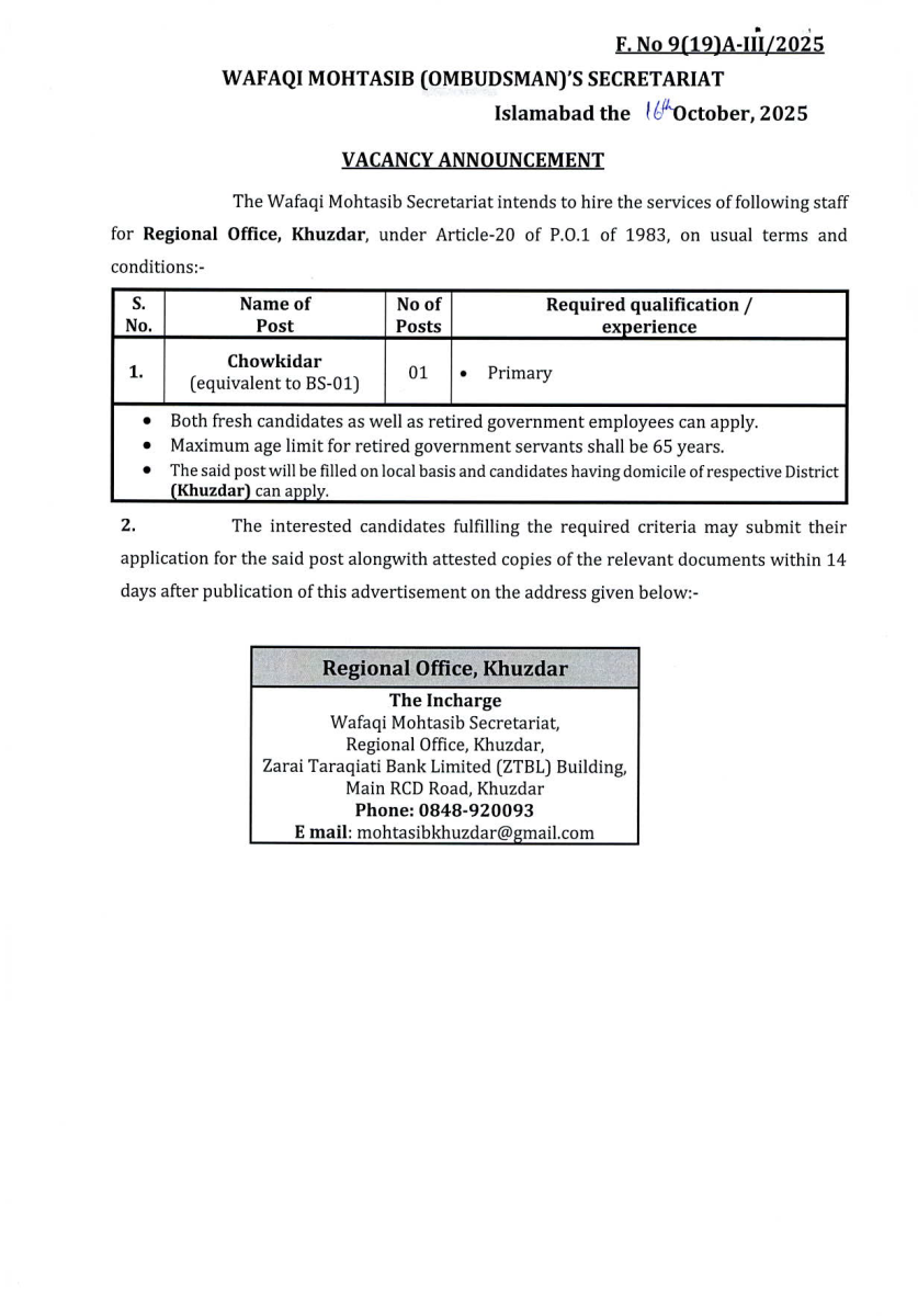 Job opportunity on contract basis under Article-20 of P.O.1 of 1983 for the Wafaqi Mohtasib Secretariat (WMS) Regional Office Khuzdar