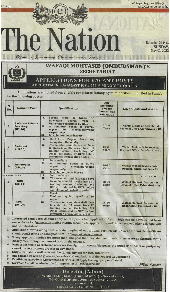 Wafaqi Mohtasib (Ombudsman)'s Secretariat وفاقی محتسب سیکر ٹیر یٹ