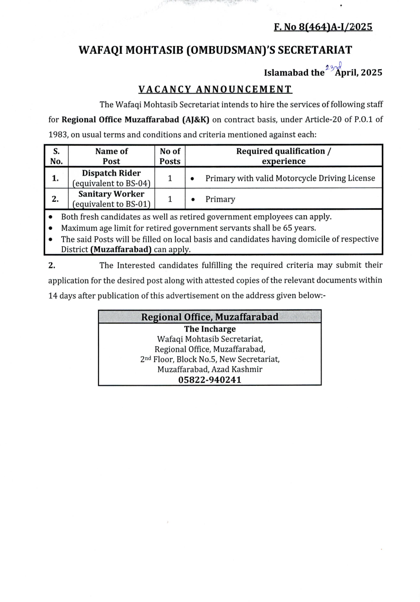 Job opportunity on the contract basis under Article-20 of P.O.1 of 1983 for the Wafaqi Mohtasib Secretariat (WMS) Regional Offices AJ&K.
