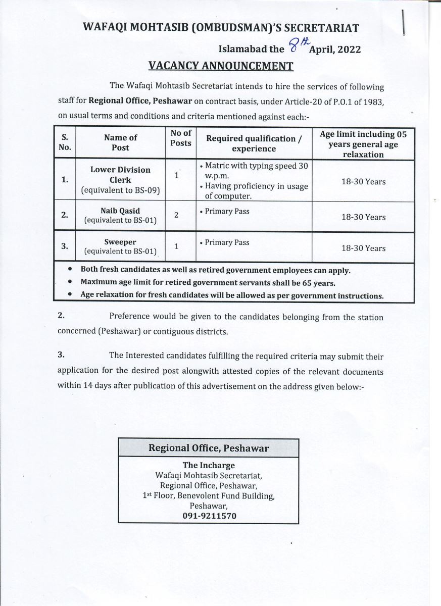 Job opportunities on the contract basis under Article-20 of P.O.1 of 1983 for the Wafaqi Mohtasib Secretariat (WMS) Regional Office Peshawar.