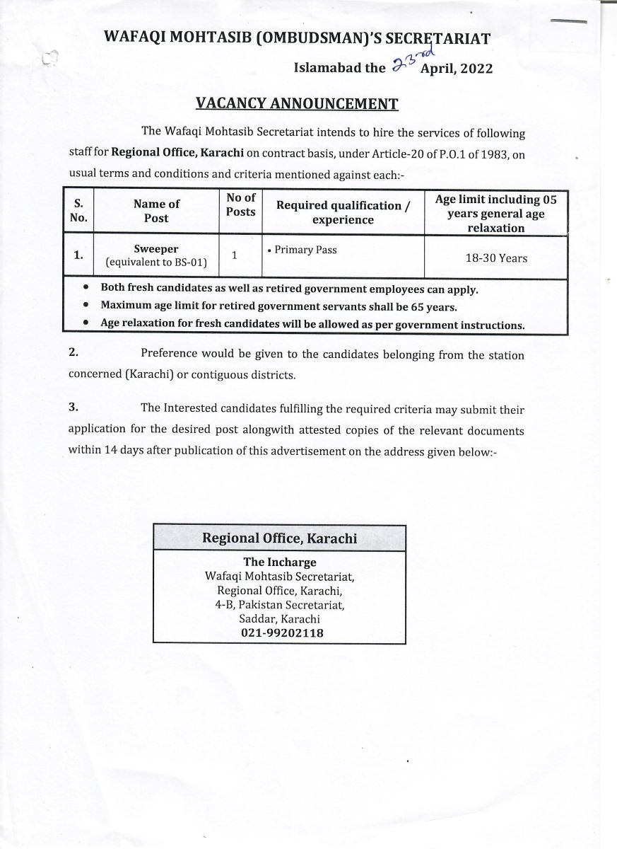 Job opportunity on the contract basis under Article-20 of P.O.1 of 1983 for the Wafaqi Mohtasib Secretariat (WMS) Regional Office Karachi