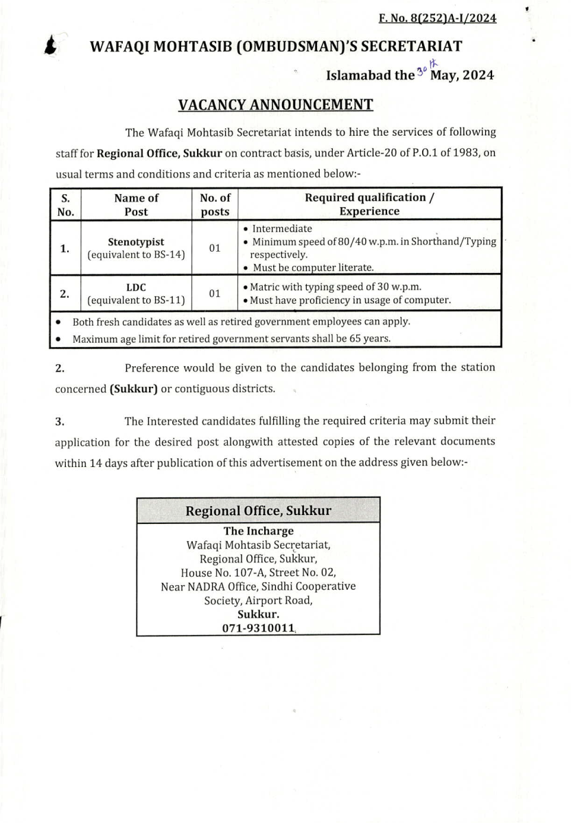 Job opportunity on contract basis under Article-20 of P.O.1 of 1983 for the Wafaqi Mohtasib Secretariat (WMS) Regional Office Sukkur.