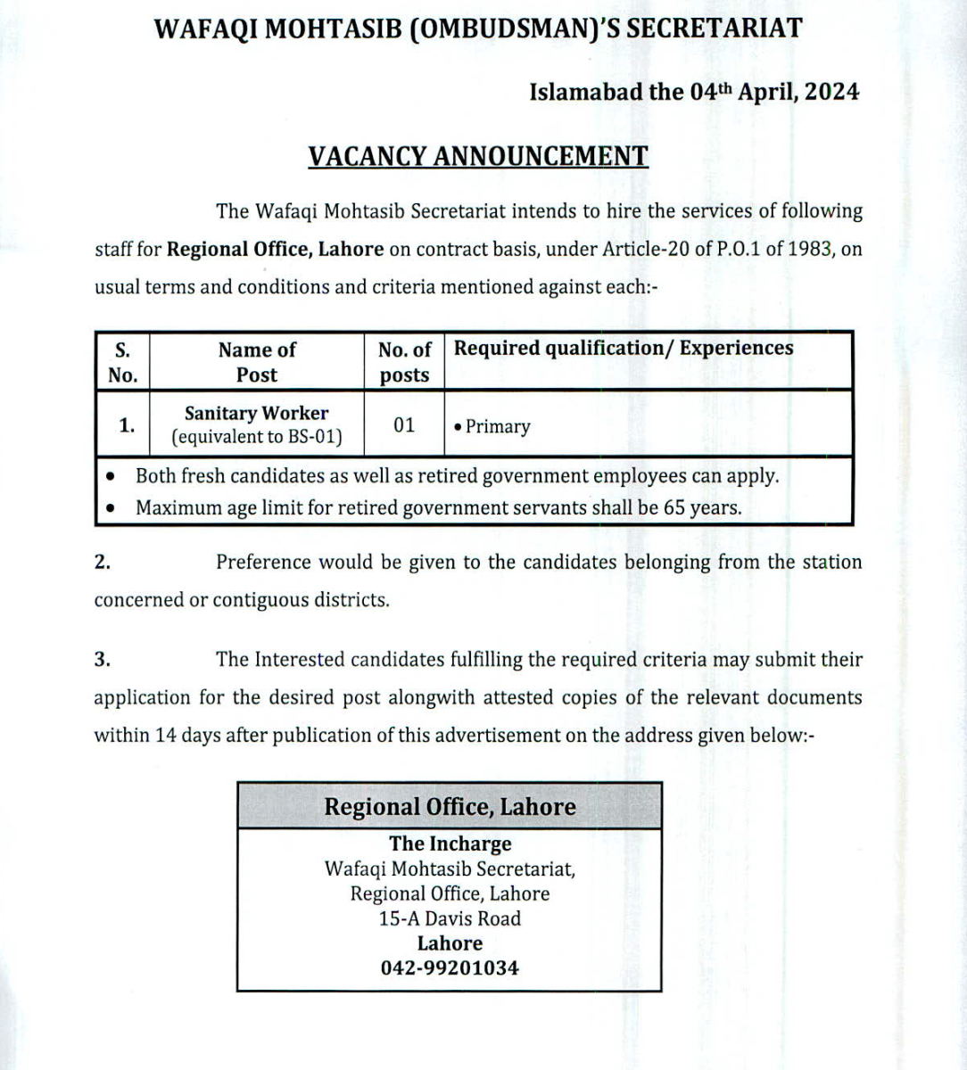 Job opportunity on the contract basis under Article-20 of P.O.1 of 1983 for the Wafaqi Mohtasib Secretariat (WMS) Regional Office Lahore.