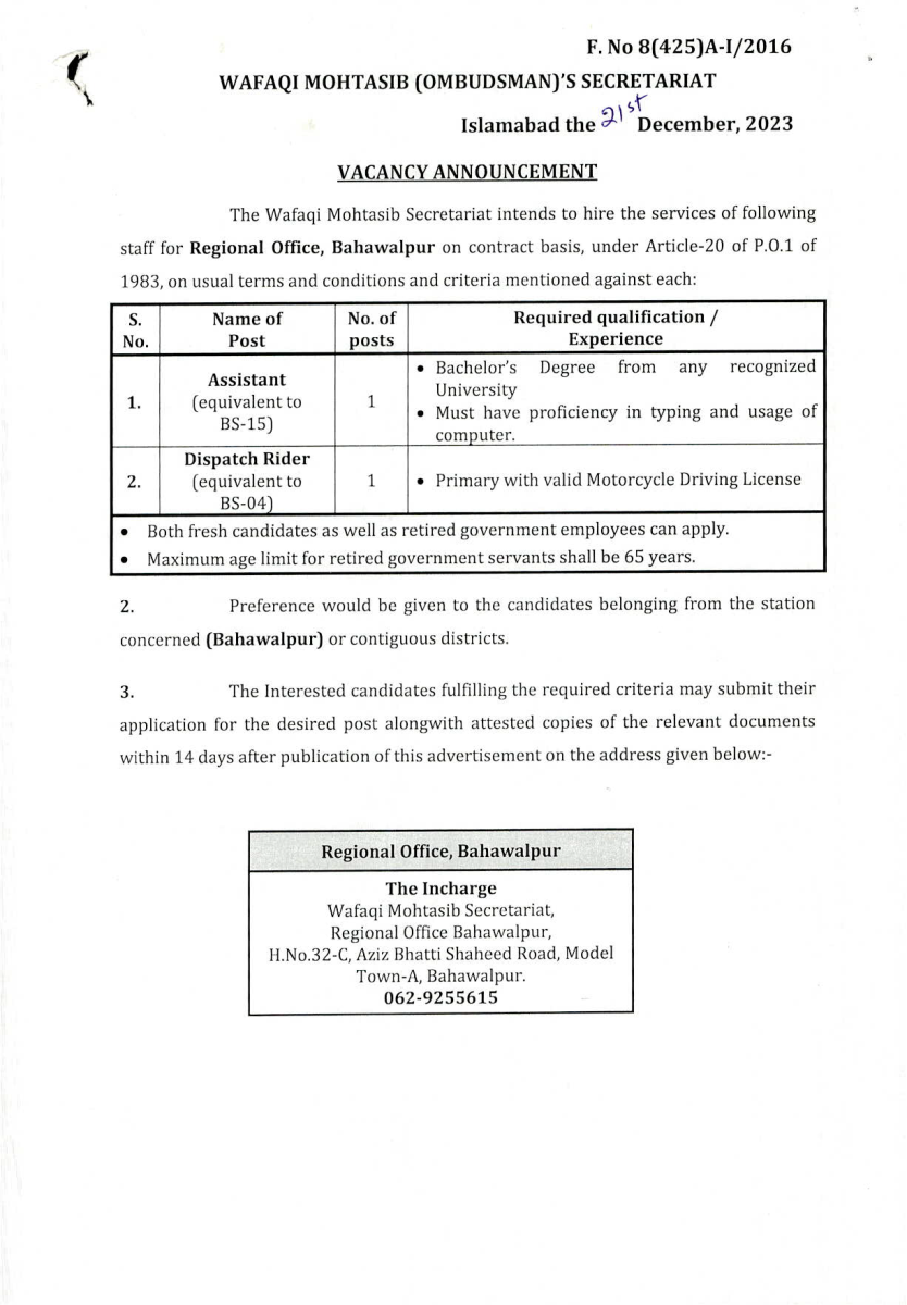 Job opportunity on the contract basis under Article-20 of P.O.1 of 1983 for the Wafaqi Mohtasib Secretariat (WMS) Regional Office Bahawalpur.