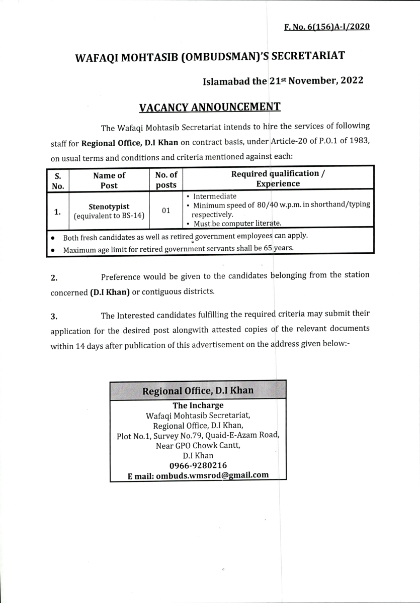 Job opportunities on contract basis under Article-20 of P.O.1 of 1983 for the Wafaqi Mohtasib Secretariat (WMS) Regional Office D. I Khan.