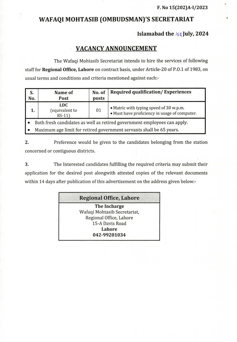 Job opportunities on the contract basis under Article-20 of P.O.1 of 1983 for the WMS Regional Office Lahore.