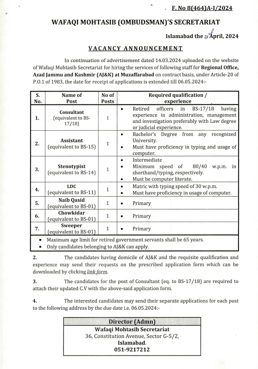 Job opportunity on the contract basis under Article-20 of P.O.1 of 1983 for the Wafaqi Mohtasib Secretariat (WMS) Regional Offices AJ&K.