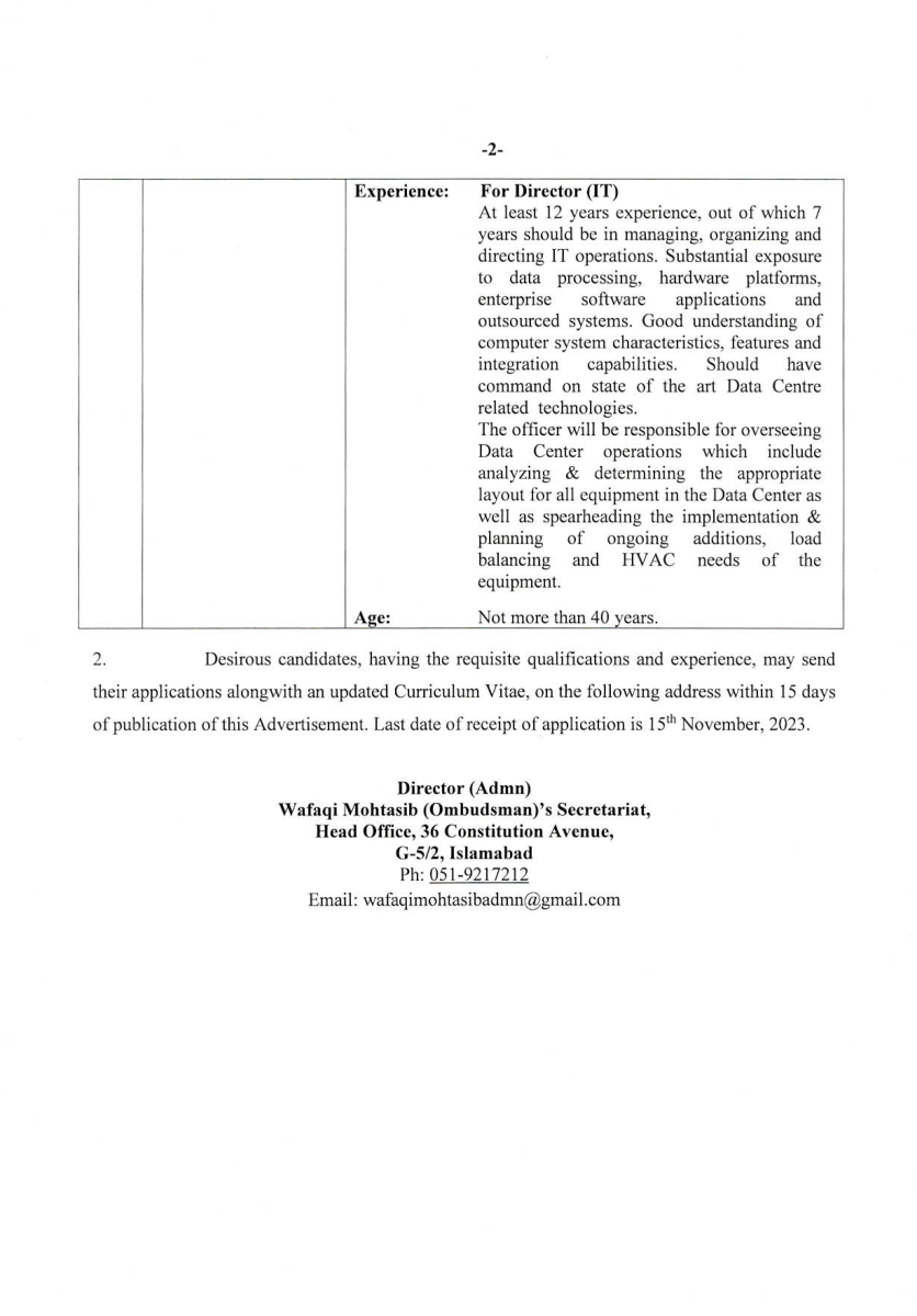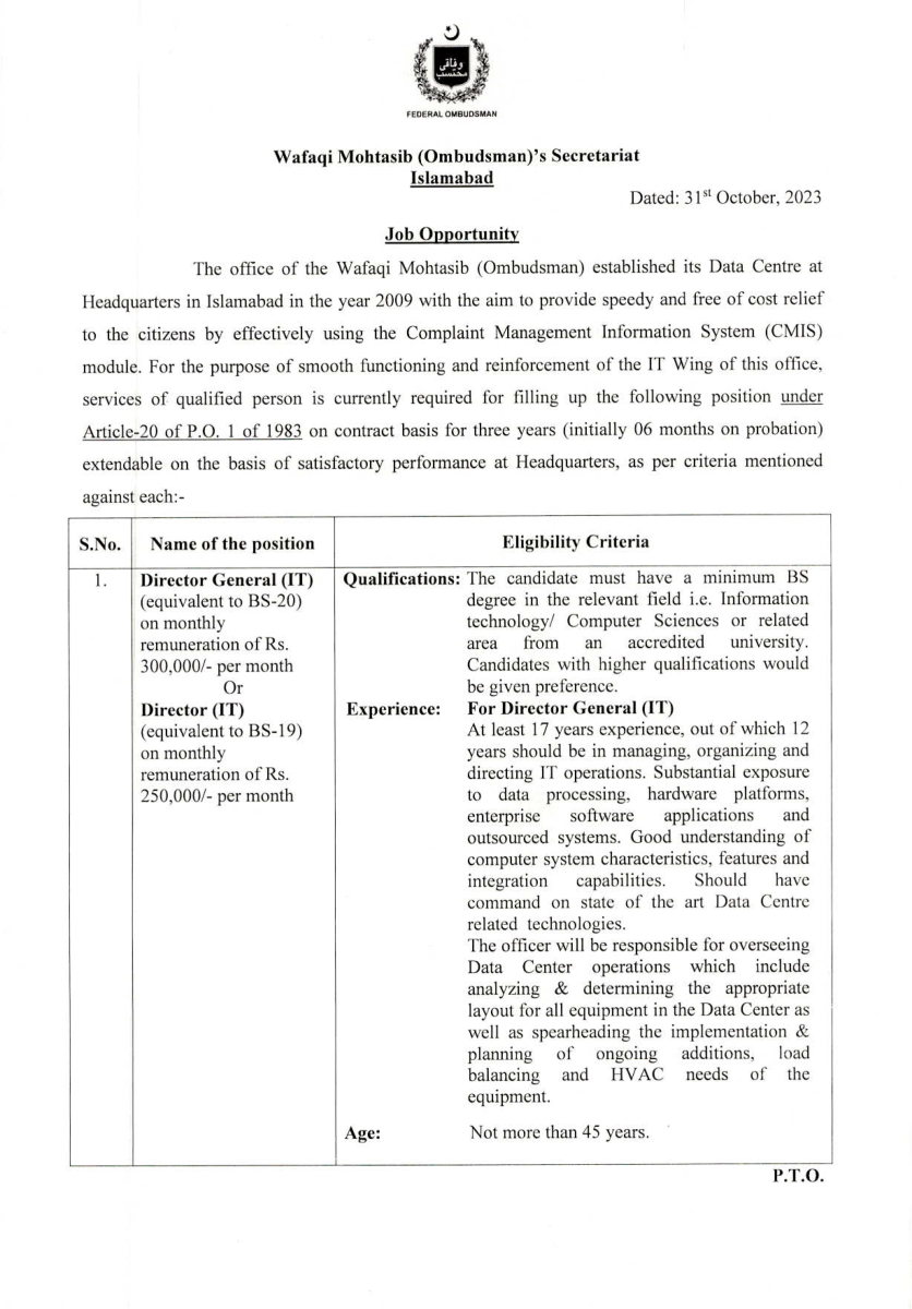 Job opportunity on contract basis under Article-20 of P.O.1 of 1983 for the Wafaqi Mohtasib Secretariat (WMS) Head Office.