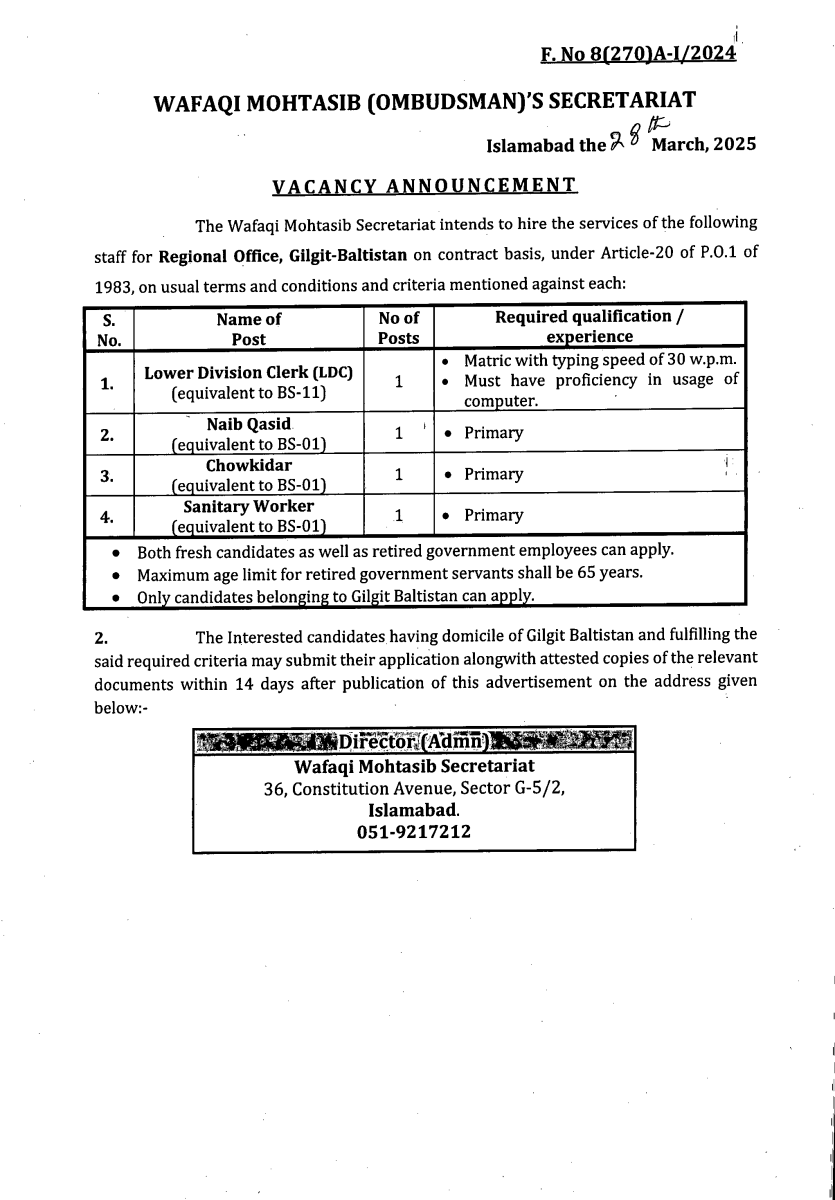 Job opportunities on the contract basis under Article-20 of P.O.1 of 1983 for the Wafaqi Mohtasib Secretariat (WMS) Regional Office Gilgit-Baltistan..