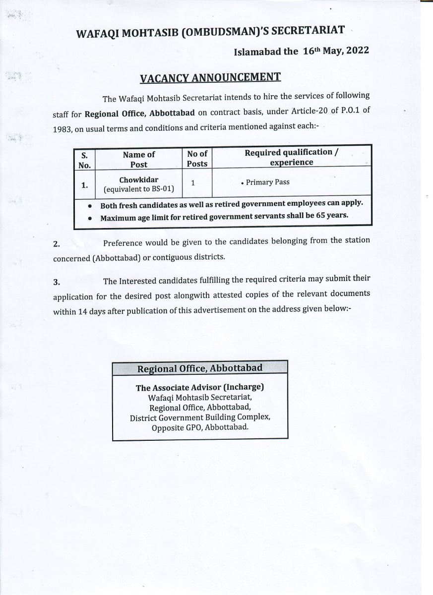 Job opportunity on the contract basis under Article-20 of P.O.1 of 1983 for the Wafaqi Mohtasib Secretariat (WMS) Regional Office Abbottabad.