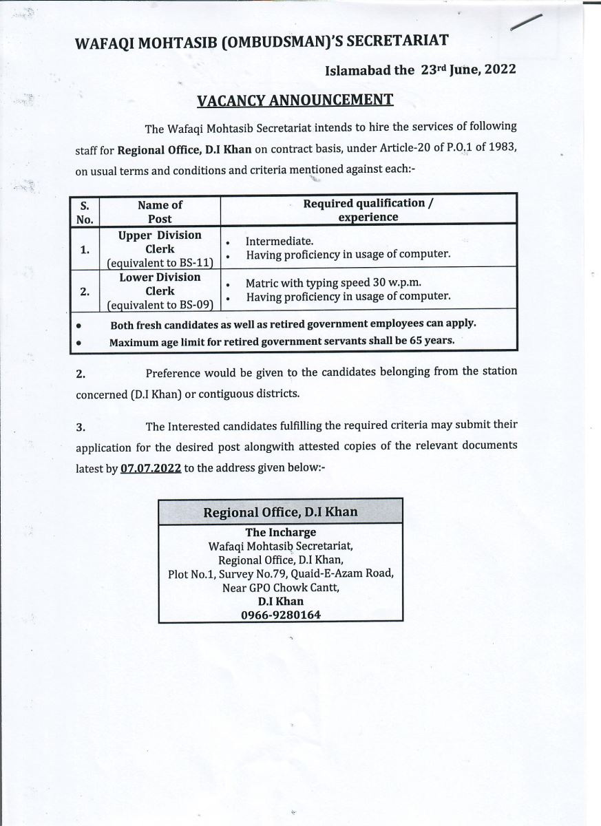 Job opportunities on contract basis under Article-20 of P.O.1 of 1983 for the Wafaqi Mohtasib Secretariat (WMS) Regional Office D. I Khan
