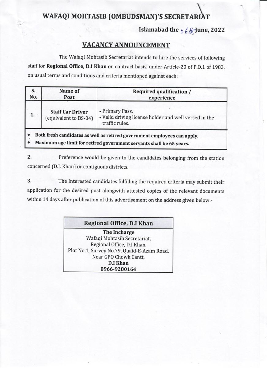 Job opportunity on contract basis under Article-20 of P.O.1 of 1983 for the Wafaqi Mohtasib Secretariat (WMS) Regional Office D. I Khan.
