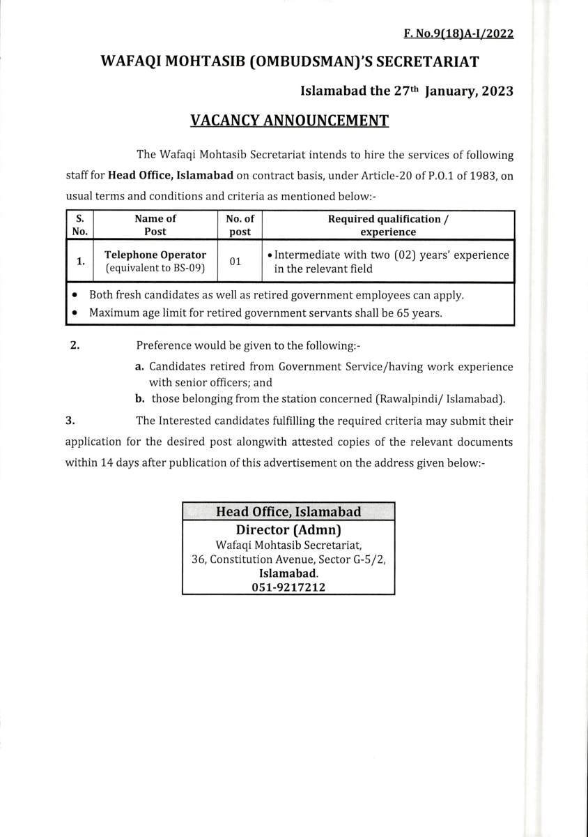 Job opportunity on contract basis under Article-20 of P.O.1 of 1983 for the Wafaqi Mohtasib Secretariat (WMS) Head Office