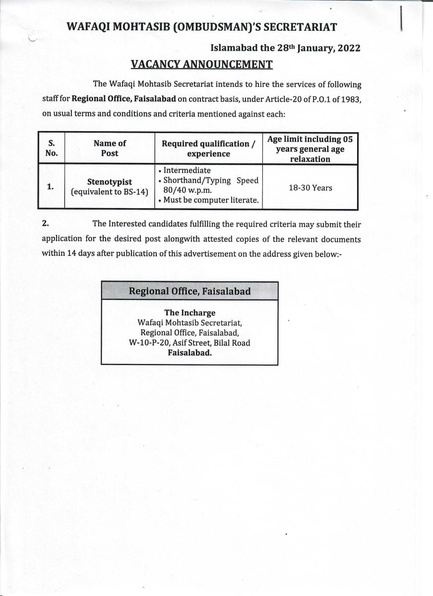 Job opportunity on the contract basis under Article-20 of P.O.1 of 1983 for the Wafaqi Mohtasib Secretariat (WMS) Regional Offices Faisalabad.
