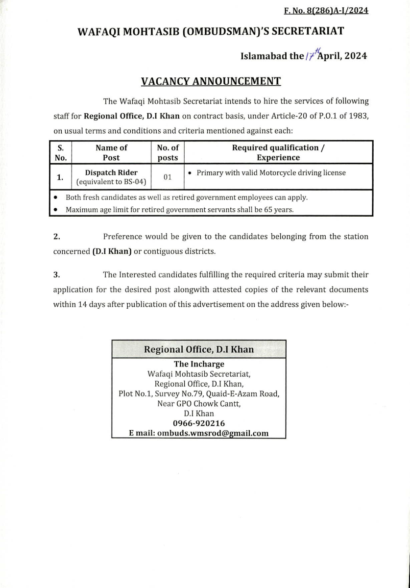 Job opportunities on the contract basis under Article-20 of P.O.1 of 1983 for the WMS Regional Office D.I Khan.