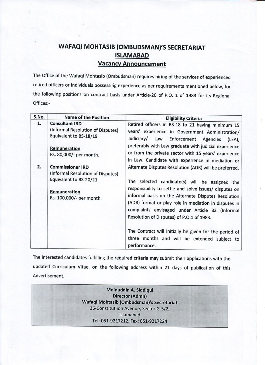 Job opportunities on contract basis under Article-20 of P.O.1 of 1983 for the Wafaqi Mohtasib Secretariat (WMS) different Regional Offices.