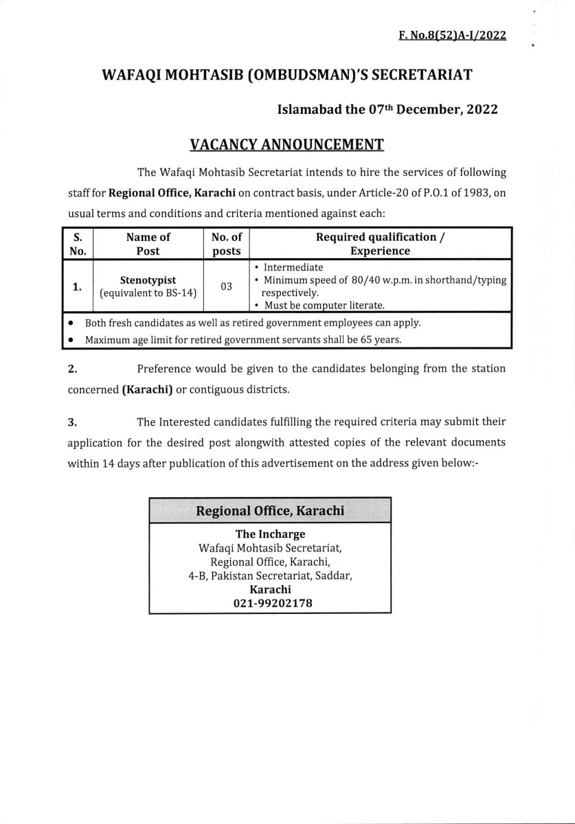 Job opportunity on the contract basis under Article-20 of P.O.1 of 1983 for the Wafaqi Mohtasib Secretariat (WMS) Regional Office Karachi