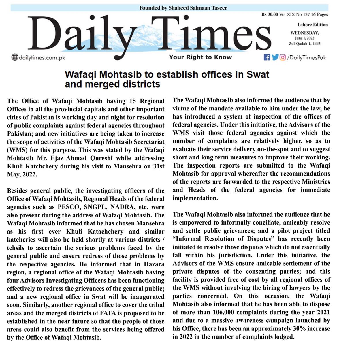 Wafaqi Mohtasib to establish offices in Swat and merged districts