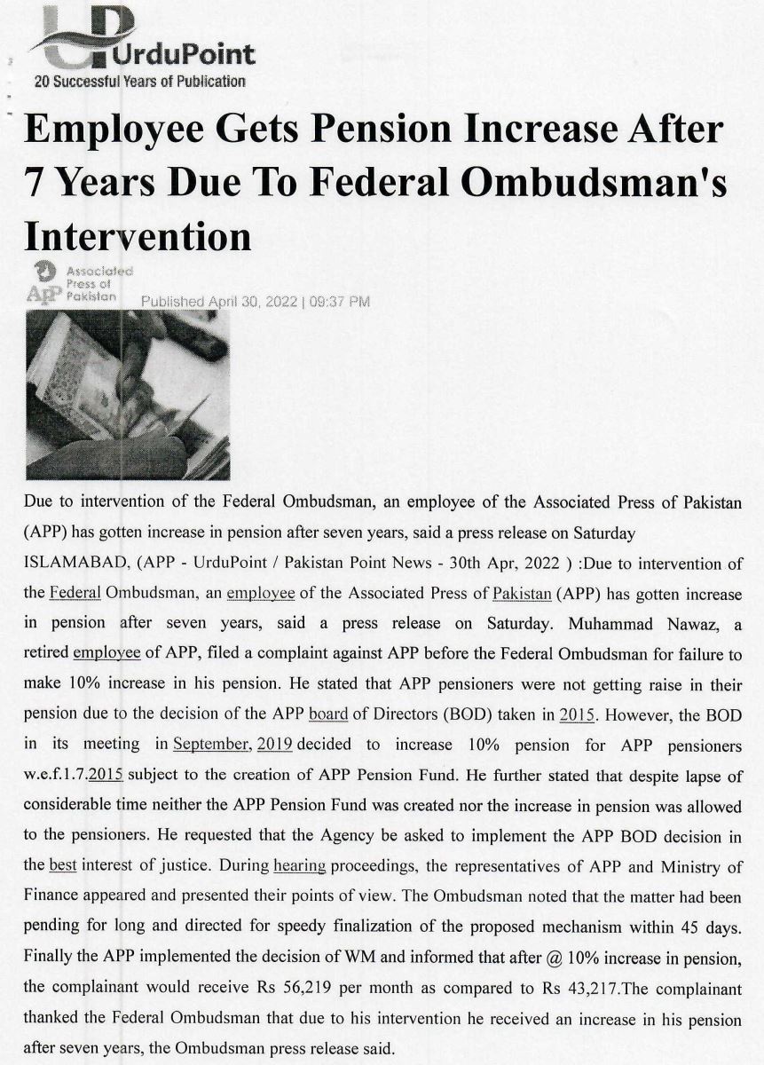 Employee gets pension increase after 7 years due to Federal Ombudsman's intervention