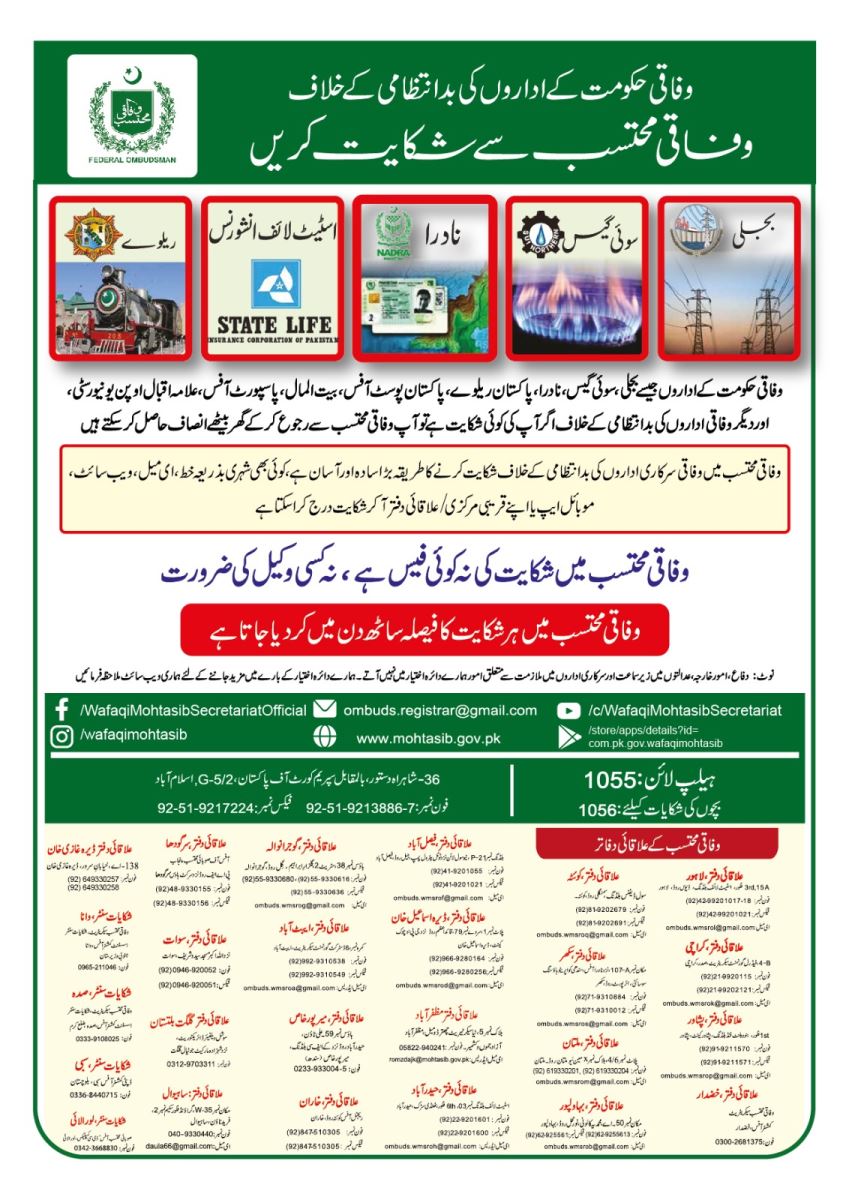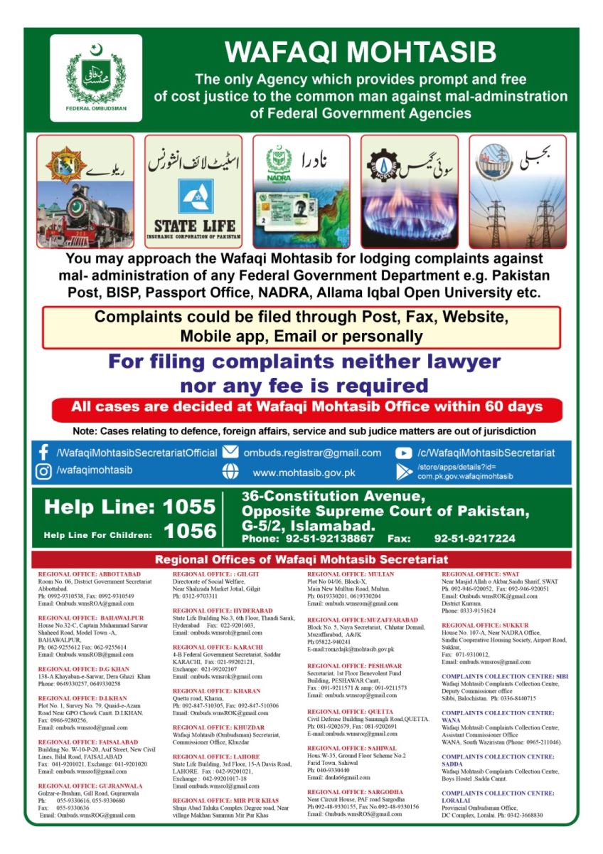 Welcome to the website of Wafaqi Mohtasib. My team and I are here to help you resolve your grievances against federal government agencies. We would ensure prompt redressal of your grievances.