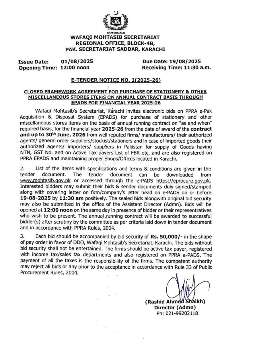 Tender Notice (2025-26): Procurement of Stationery & other misc. items for the Wafaqi Mohtasib Secretariat (WMS) Regional Office Karachi.