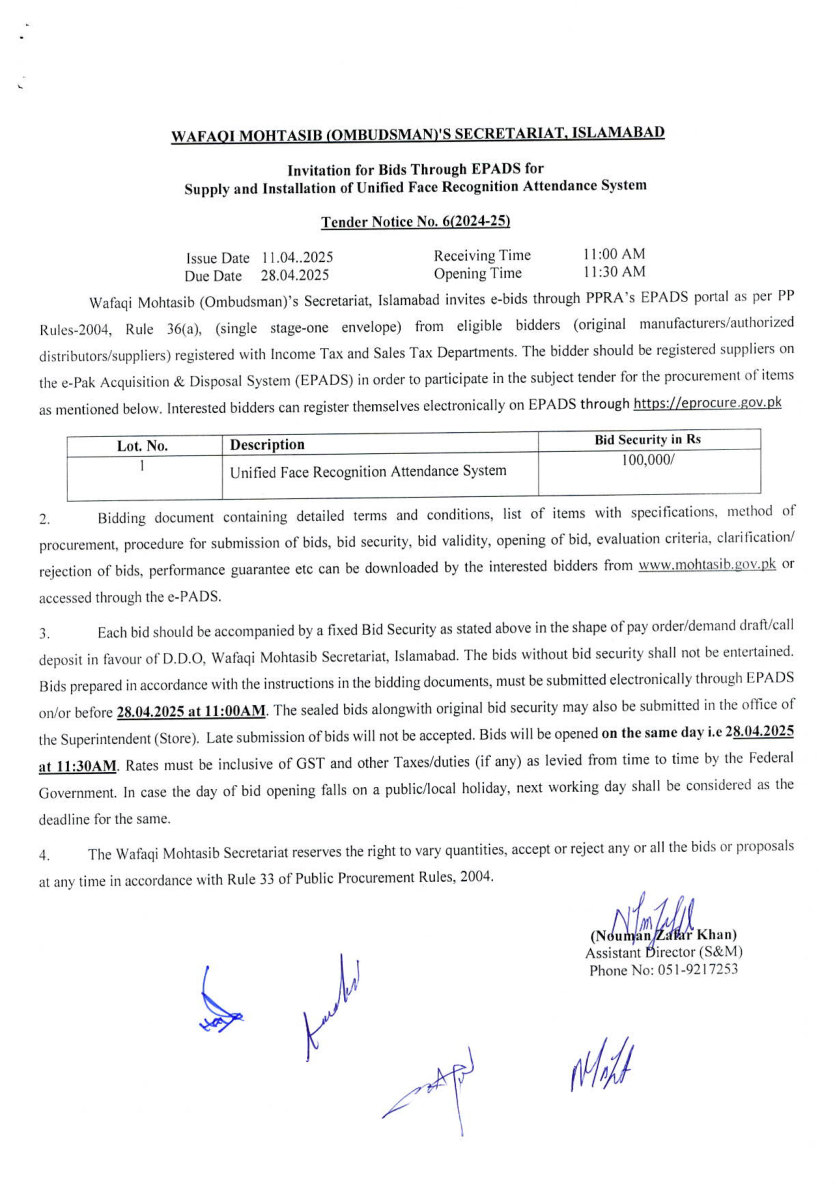 Invitation for Bids Through EPADS for Supply and Installation of Unified Face Recognition Attendance System.
