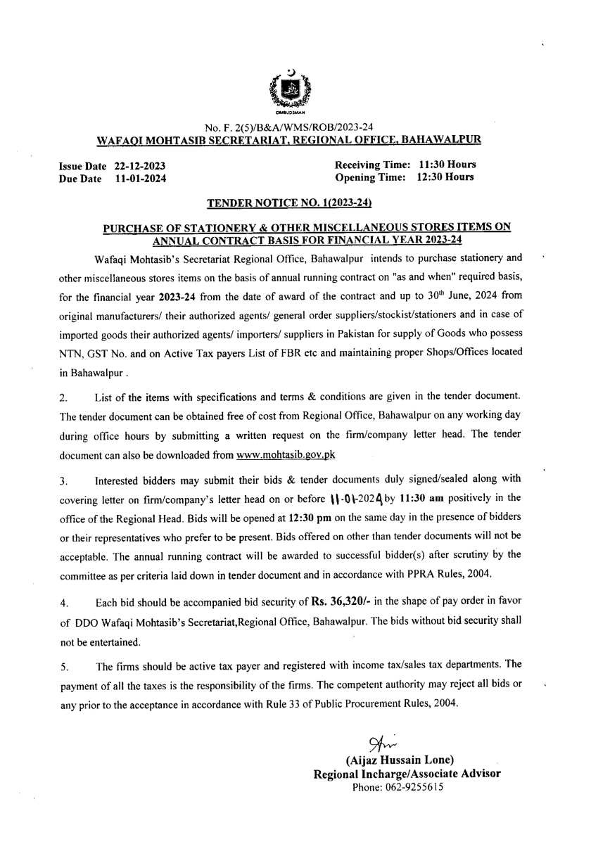 Bahawalpur Tender Notice (2023-24): Procurement of misc. items for the Wafaqi Mohtasib Secretariat (WMS) Regional Office Bahawalpur.