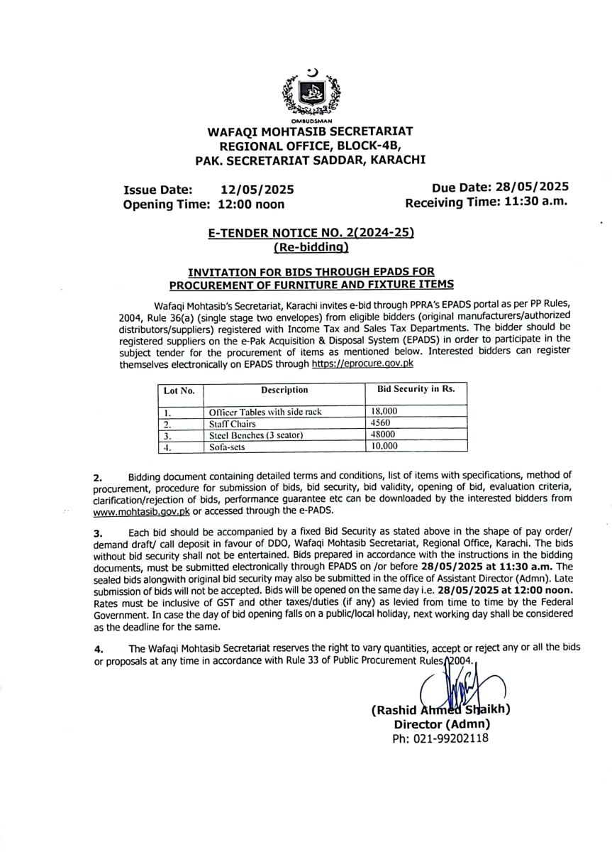 Purchase of Furniture and Fixtures for the Wafaqi Mohtasib Secretariat (WMS) Regional Office Karachi through EPADS.