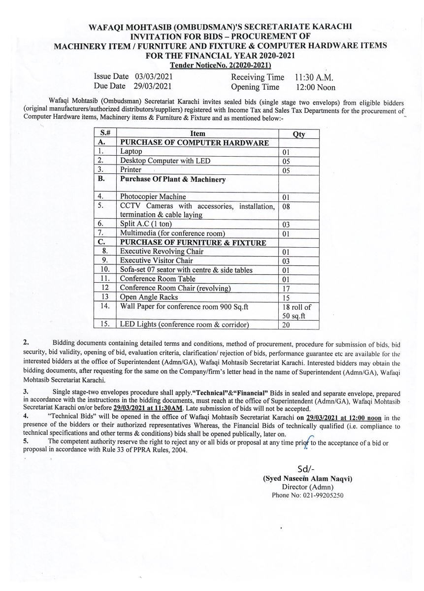 Tender Notice No. 2 KHR: Procurement of computer hardware/ machinery item/ furniture and fixture for the WMS Regional Office, Karachi.