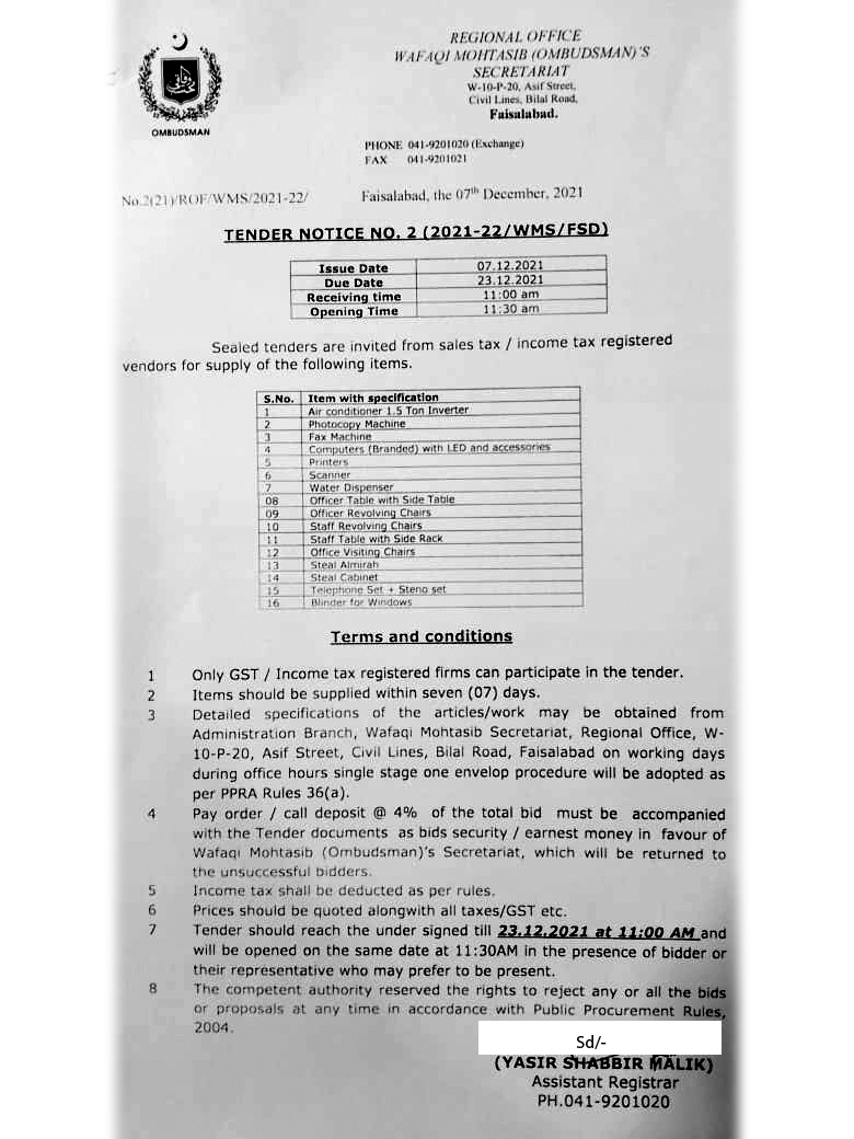 FSD Tender Notice No. 2 (2021-22): Procurement of misc. items for the Wafaqi Mohtasib Secretariat (WMS) Regional Office Faisalabad.