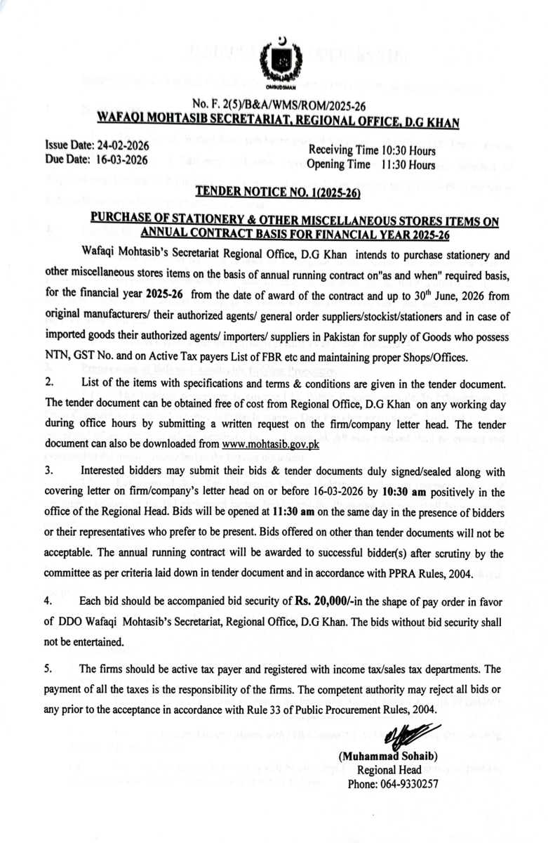 Tender Notice (2025-26): Procurement of Stationery & other misc. items for the Wafaqi Mohtasib Secretariat (WMS) Regional Office DG Khan..