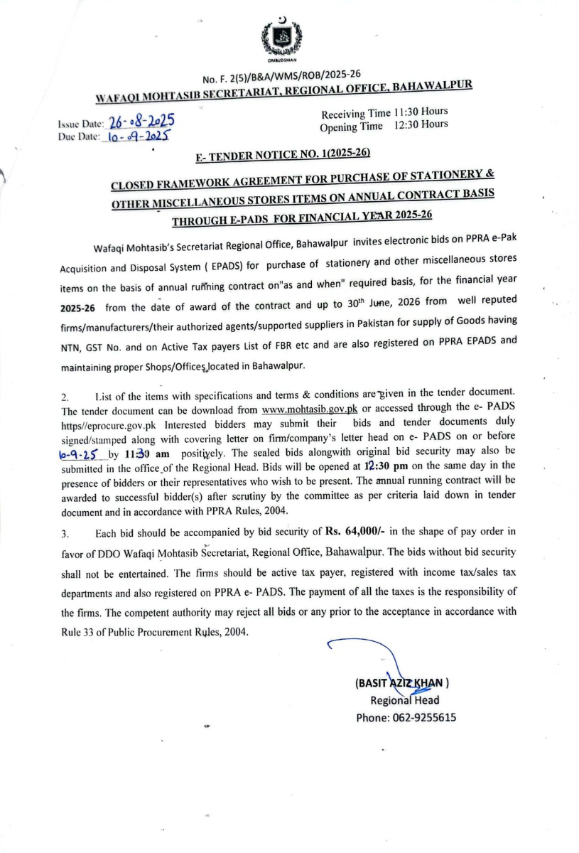 Tender Notice No. 1 (2025-26): Procurement of Stationery & other misc. items for the Wafaqi Mohtasib Secretariat (WMS) Regional Office Bahawalpur.