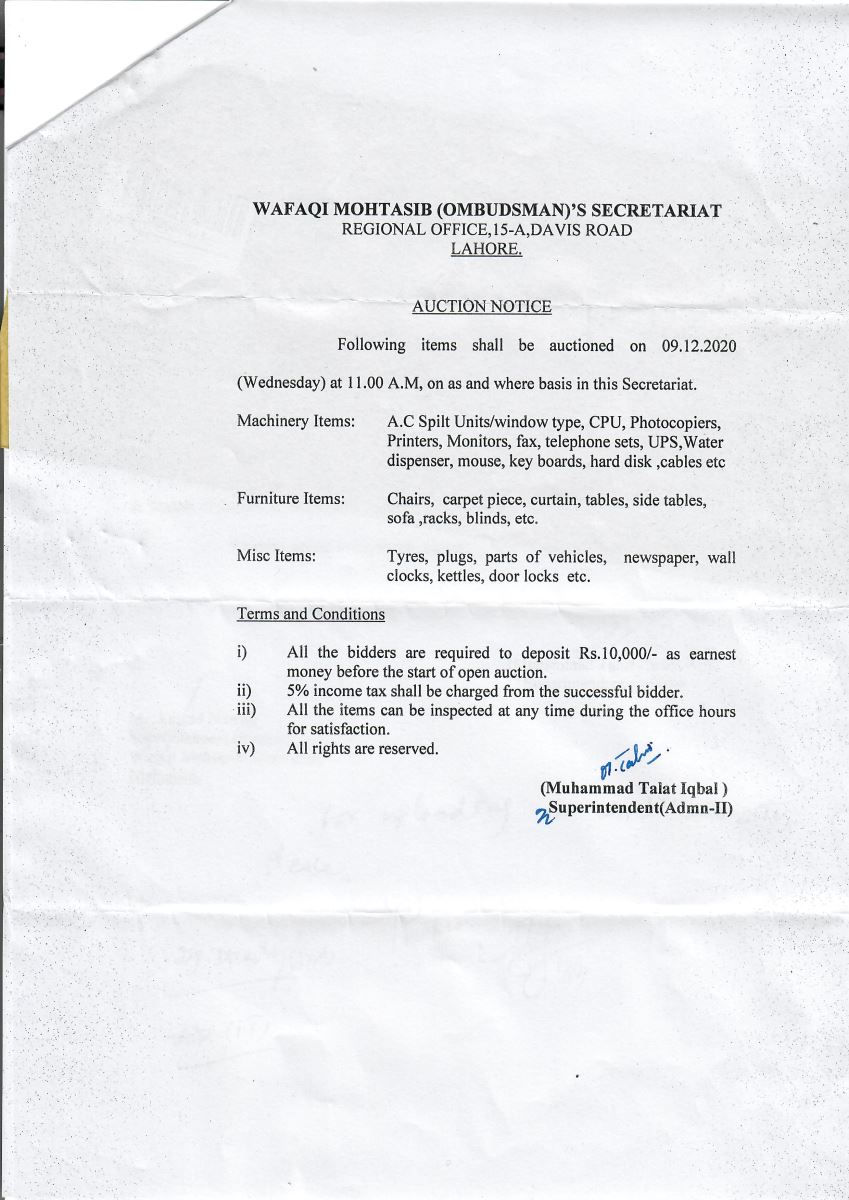 Uploaded on 16-11-2020: Auction Notice (F.IV(67)/WMS/ROL/93: Auction of miscellaneous items.