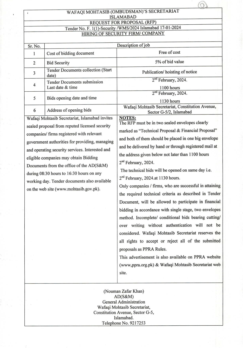Hiring of Security Firm / Company for Head Office Islamabad.