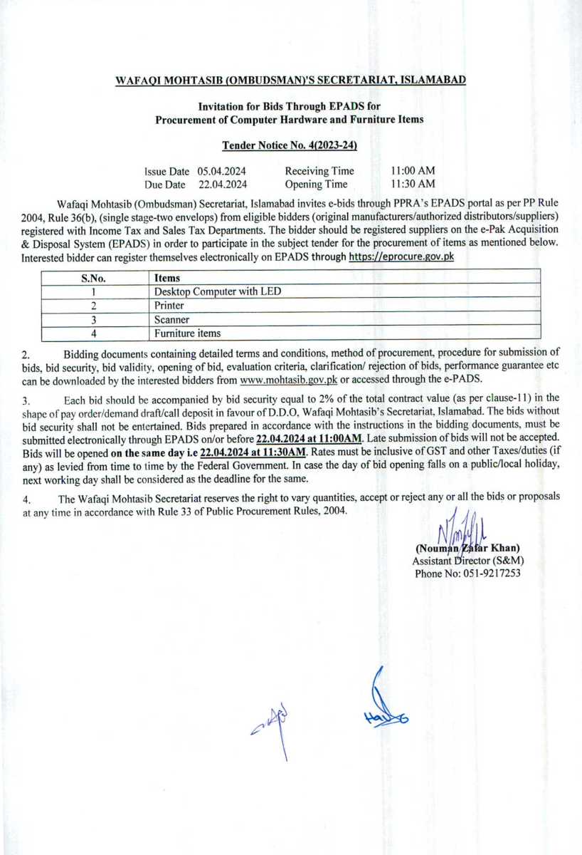 Procurement of Computer Hardware and Furniture (Tender Notice No. 4/2023-24)
