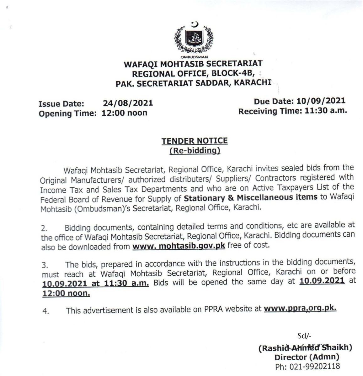 KHR Re-Tender Notice No. 1 (2021-22): Procurement of Stationery & other misc. items for the Wafaqi Mohtasib Secretariat (WMS) Regional Office Karachi.