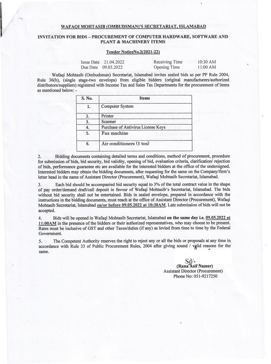 ISB Tender Notice 2 (2021-22): Procurement of computer hardware, software and misc. items for the Head Office Islamabad.
