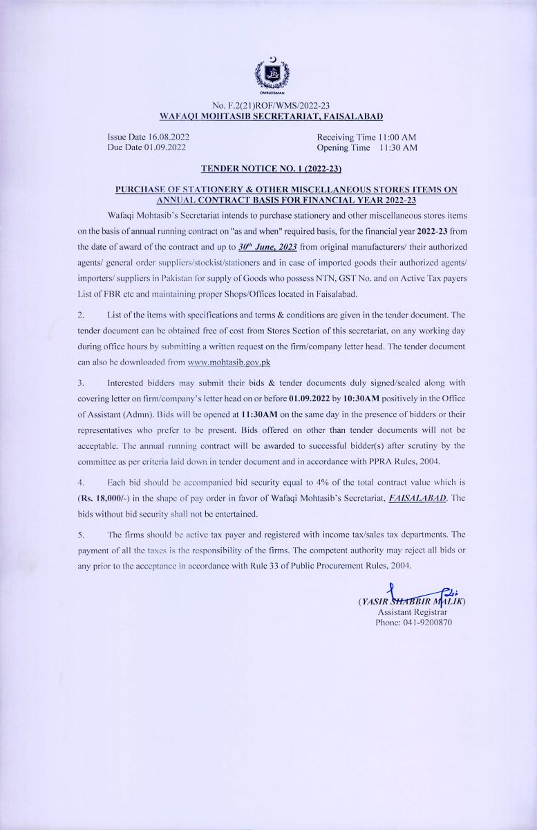 FSD Tender Notice No. 1 (2022-23): Procurement of misc. items for the Wafaqi Mohtasib Secretariat (WMS) Regional Office Faisalabad.