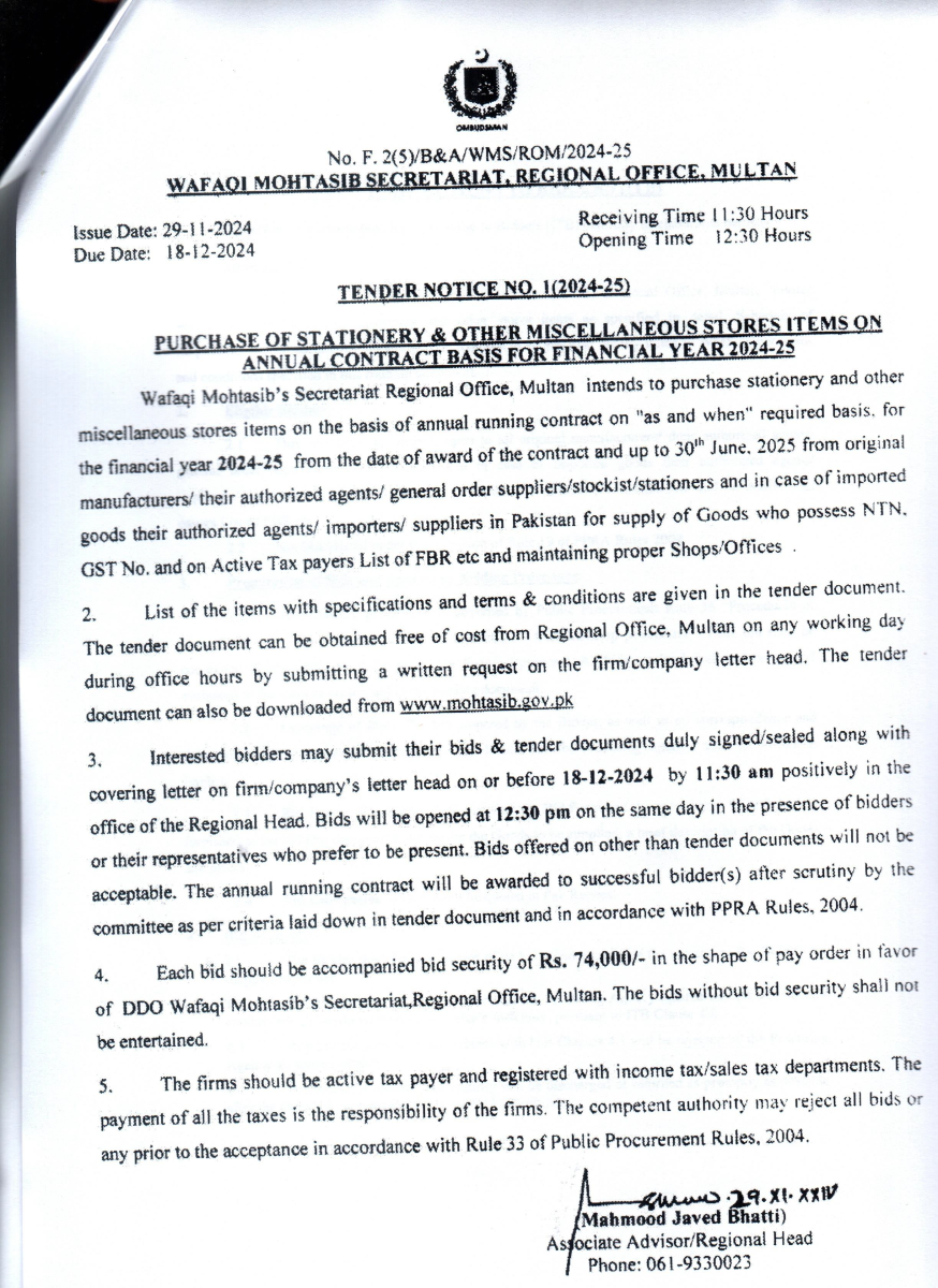 Tender Notice No. 1 (2024-25): Procurement of Stationery & other misc. items for the Wafaqi Mohtasib Secretariat (WMS) Regional Office Multan.