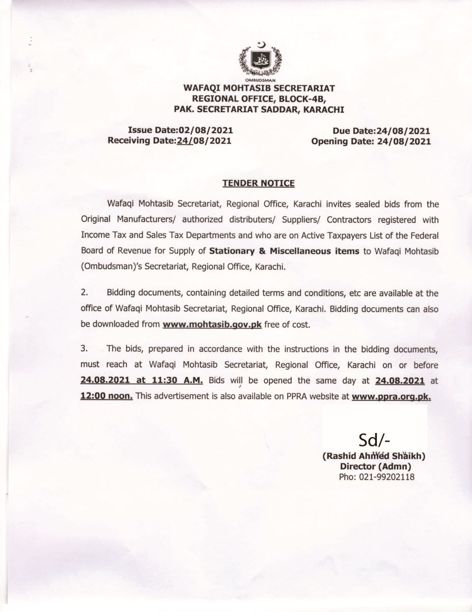 KHR Tender Notice No. 1 (2021-22): Procurement of Stationery & other misc. items for the Wafaqi Mohtasib Secretariat (WMS) Regional Office Karachi.