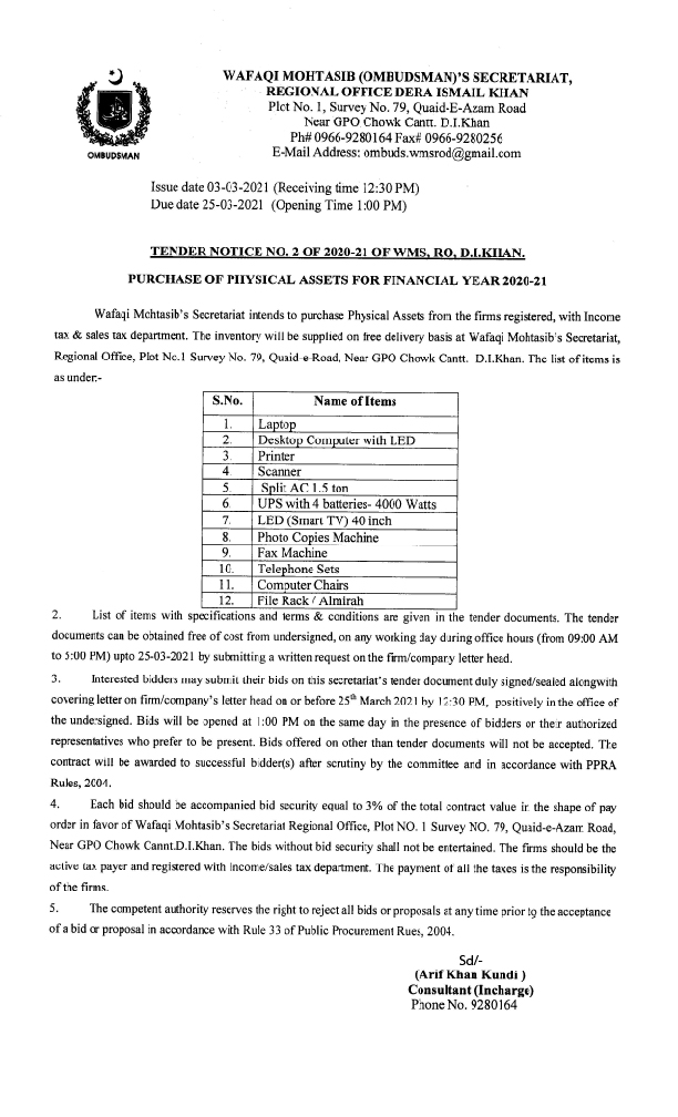Tender Notice No. 2 DIK: Procurement of physical assets for Wafaqi Mohtasib Secretariat Regional Office D.I. Khan.